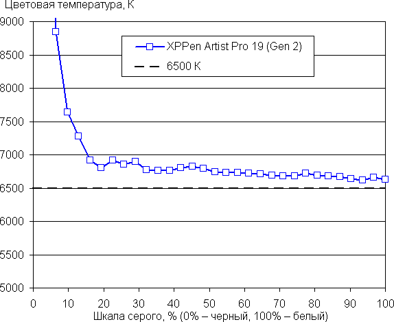 Баланс оттенков на шкале серого хороший, так как цветовая температура достаточно близка к стандартным 6500 К, а отклонение от спектра абсолютно черного тела (ΔE) ниже 10, что для потребительского устройства считается приемлемым показателем. При этом цветовая температура и ΔE мало изменяются от оттенка к оттенку — это положительно сказывается на визуальной оценке цветового баланса. (Самые темные области шкалы серого можно не учитывать, так как там баланс цветов не имеет большого значения, да и погрешность измерений цветовых характеристик на низкой яркости большая.)