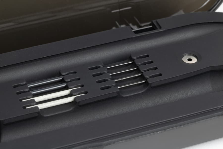 Наконечники (жала, перья, грифели) аккуратно разложены внутри пенала по своим «посадочным местам».