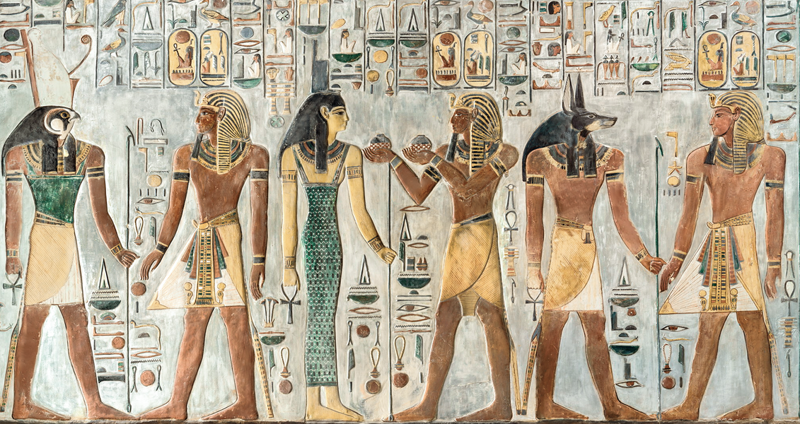 Начинать нужно с поиска того, как должны выглядеть Хор, Исе́т (Исида), Инпу́ (Анубис) и общающийся с ними бывший обитатель гробницы, потому что на приведенном фото невозможно разобрать важные детали (в реальной жизни, без предшествовавшей общей обработки, картина совсем удручающая). По счастью, в гробнице можно найти изображения упомянутых богов и почившего царя в более сохранном виде. Это дает возможность использовать их для восстановления большинства подробностей некогда великолепного рельефа, безнадежно загубленного в XIX веке руками ранних египтологов, которые не знали ни истории, ни языка Древнего Египта и не скрывали главного побудительного мотива своих археологических штудий — желания разбогатеть на торговле древними диковинами.