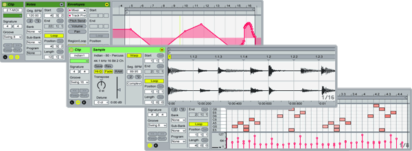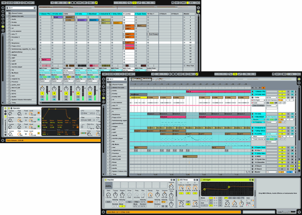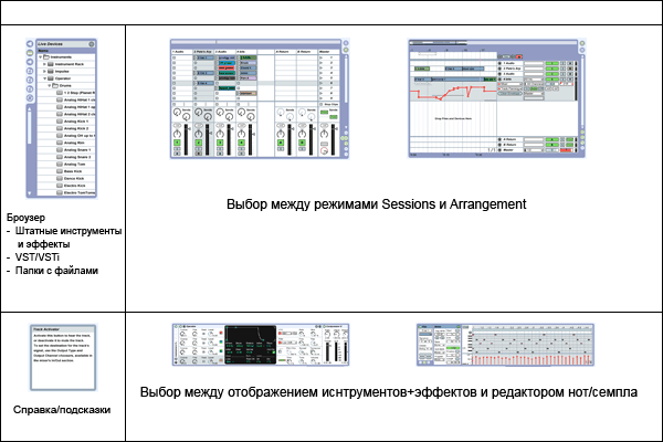 Основные режимы работы — это Sessions (режим лупов и для живых выступлений DJ) и Arrangement (студийный режим). Ориентир на работу с ноутбуком сказался на структуре рабочего окна. В CuBase, OrionPro и т. п. используется оконный режим, где каждому окну можно задать свой размер и расположение. Однако обилие окон, перекрывающих друг друга не слишком удобно, если ноутбук без мыши. Еще нужно тратить время на поиск «затонувшего» под другими окнами нужного окна, что неприятно на живых выступлениях, где работать надо в real-time.