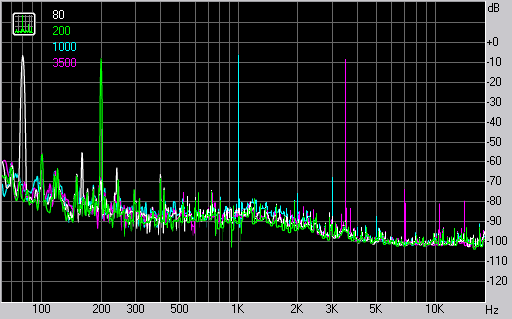 Уровень искажений весьма неплох во всем диапазоне частот. На графике можно видеть спектр в нескольких контрольных точках.