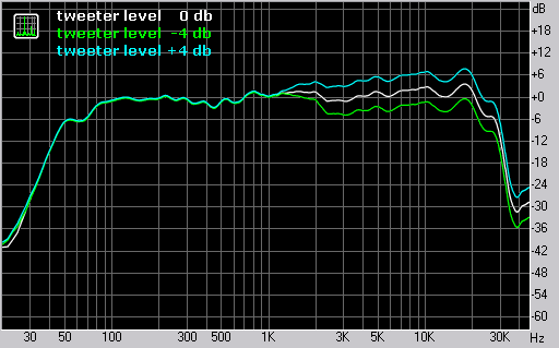 На измеренных графиках АЧХ мы видим, что регулировка относительной громкости ВЧ-динамика производится, начиная уже с 1 кГц. При этом в диапазоне 2,5 кГц — 20 кГц значение ±4 дБ не изменяется.