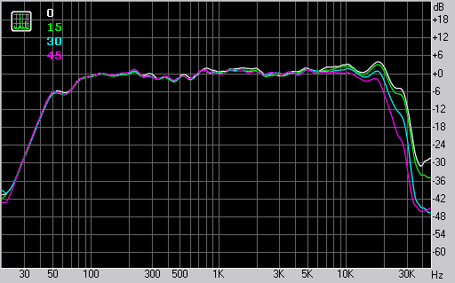 На графиках АЧХ, измеренных под разным углом, можно видеть, что при отклонении измерительного микрофона от оси ВЧ-динамика на 45 градусов, падение амплитуды на 15 кГц составляет всего 3 дБ. Диаграмма направленности у высокочастотного динамика, изготовленного по технологии A.R.T, достаточно широкая и ничуть не уступает традиционным купольным пищалкам.