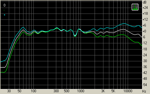На измеренных графиках можно наглядно видеть, каким образом изменяется АЧХ при разных положениях регуляторов. График АЧХ белого цвета измерен в нейтральном положении регуляторов. Зеленый и синий графики представляют крайние положения.