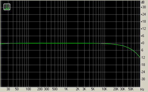 На высоких частотах виден спад, однако отклонение в слышимом диапазоне небольшое, на 20 кГц отклонение не превышает 1 дБ.
