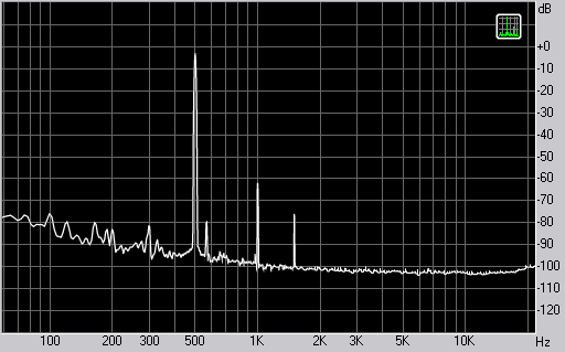 В целом количество гармонических искажений у наушников ATH-A500 чуть меньше среднего. На измерениях можно видеть, что спектр достаточно чистый. Наибольшее количество гармоник наблюдается в низкочастотной и высокочастотной областях. Однако возникающие гармоники являются кратными и по большей части ограничиваются второй и третьей гармоникой.