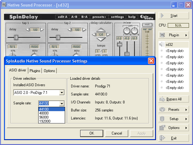 При нажатии на кнопку Launch NSP вызывается фирменная фича драйверов карты — специальная панель Native Sound Processor. В ней вы можете в реальном времени наложить любой имеющийся у вас VST-эффект на любой вход/выход карты, не используя при этом VST-секвенсор. Это дает возможность обычным пользователям, не имеющим навыки работы с музыкальными приложениями, наложить профессиональные эффекты, тем более, что во входящем в комплект демо-пакете VST-эффектов предостаточно. Таким образом, производитель компенсирует отсутствие аппаратной обработки звука процессором карты для любителей «покрутить ручки» и придать звуку необычный оттенок, либо для использования компьютера в качестве эффект-процессора.