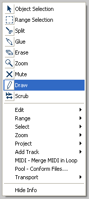В новых версиях Сubase смена курсора при редактировании трека реализована несколько иначе (наверное, многих раздражало удерживание правой кнопки мыши для смены режима). Теперь ничего удерживать не надо, а достаточно просто нажать левую кнопку мыши, и выскочившее меню никуда не денется, пока вы не выберете нужный вариант курсора.