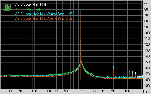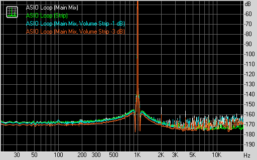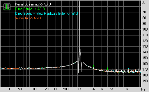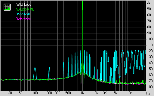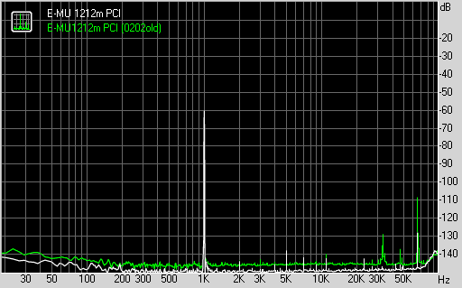 Более любопытно, что при подсоединении именно к старой E-MU1010 возрастают искажения в режиме 192 кГц. Справедливости ради, следует отметить, что искажения у старой версии наблюдаются лишь в режимах 96 и 192 кГц. Учитывая низкий уровень тестового сигнала, искажения не являются результатом перегрузки, а именно различиями в платах E-MU1010.