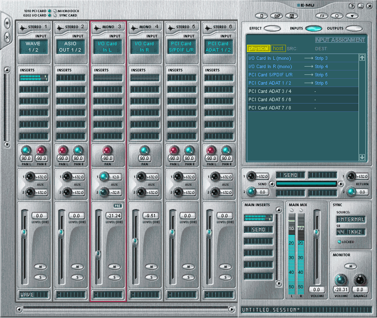 Запись сигнала через ASIO и WDM из Aux и MainПри записи сигнала через Aux или Main с моно стрипов (в случае с E-MU1212m/PCI — это аналоговые входы) при микшировании происходит сдвиг на один такт. Такой сдвиг равноценен сдвигу одной АС от слушателя на 1,5 мм, и не является критичным. Но для тех, кому важно сделать максимально качественную запись без каких-либо компромиссов, лучше использовать запись в ASIO из монострипов. Из-за наличия только одного входного стерео WDM-канала запись возможна только со сдвигом.