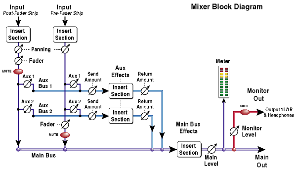 На выход сигнал можно пустить через команду Send или через выходы Main Level и Monitor Level. Это сделано для разделения уровня сигнала для мониторов и остального оборудования.