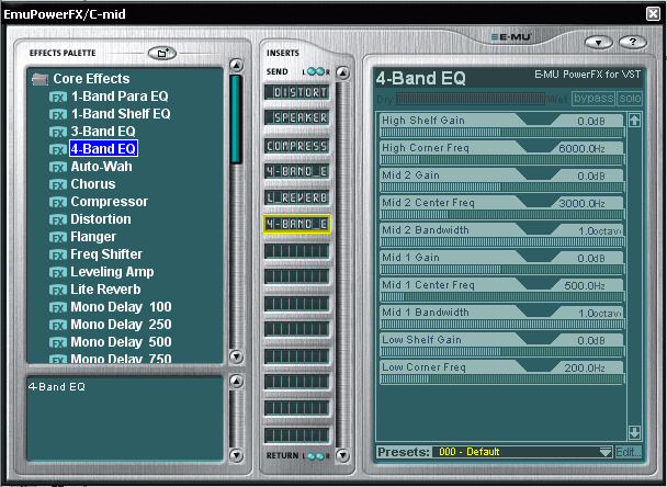 В схеме в insert section загружаются эффекты, пикметры и команды роутинга send. C одной стороны, такая жесткая схема менее гибкая, чем у KX project, а с другой стороны, E-MU предлагает некоторые команды и возможности, которых нет в KX project.