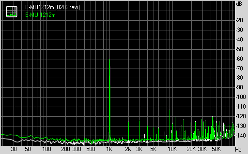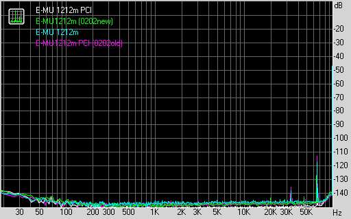 График АЧХ у E-MU1212m PCI имеет более поздний спад на высоких, это связано с выбором другой частоты для фильтра. Ранее можно было встретить жалобы, что спад в 0.3 дБ на 20 кГц негативно сказывается на качестве высоких частот. При этом забывается, что даже у сверх качественных АС неравномерность на порядок больше, и опасения завала на высоких частотах имеют больше психологический характер. Инженеры E-MU не стали никого разубеждать, а применили в новой E-MU0202m другой фильтр, с настройкой на более высокую частоту.