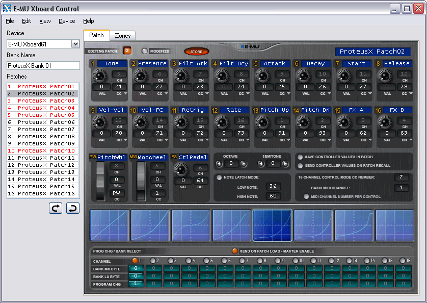 В первом окне Patch доступны различные функции программирования, смена параметров контроллеров. Здесь также можно выбрать и вид кривой velocity.