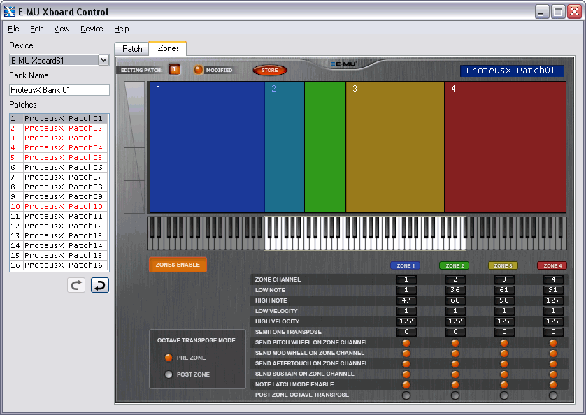 Второе окошко представляет собой распределение зон клавиатуры. Зоны очень удобно показываются различными цветами, при этом на экране отображается клавиатура полностью (более десяти октав). Созданную конфигурацию, при необходимости, можно сохранить в свой пресет. Для этого предусмотрено 16 слотов памяти, которые, при необходимости, можно переименовывать и распределять в нужной последовательности.