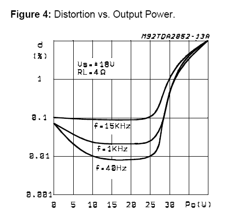 В качестве усилительных микросхем производитель использует две мономикросхемы TDA2052 от STMicroelectronics. Такие микросхемы в мониторной акустике мы встречаем впервые. Давайте взглянем на график зависимости искажений от мощности, взятый из спецификации на микросхему.