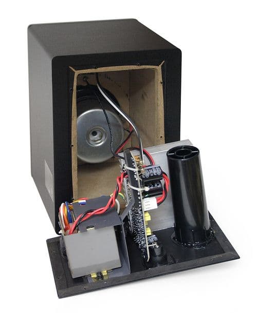 Внутри корпуса никакого наполнителя нет, и усилительная часть расположена в одной камере с динамическими головками. Тем не менее, все закреплено достаточно крепко. Например, плата с элементами крепится с трех сторон и экранирована от трансформатора. Внутри корпуса также расположен и радиатор.