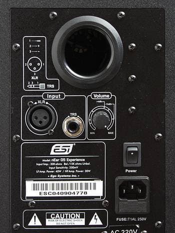 На задней панели расположен выключатель питания, регулятор громкости и два линейных входа с разъемами XLR и TRS. Возможно как балансное, так и небалансное подключение.