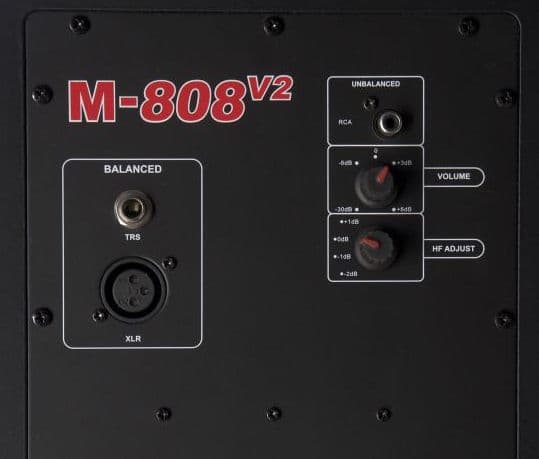 Задняя панель представляет собой металлическую пластину. Здесь расположены: разъем питания; балансные входы с разъемами ХLR и TRS-джек; небалансный вход RCA; регулятор чувствительности; регулятор высоких частот и выключатель питания.