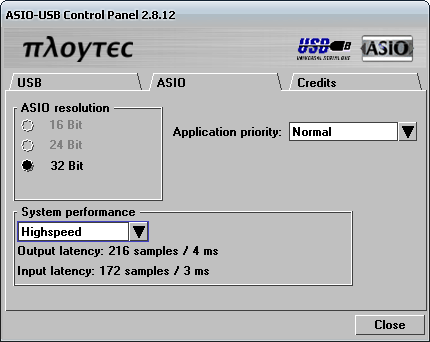 Драйвера показали себя в работе с очень хорошей стороны. Минимальная задержка сигнала достигается в положении Highspeed. Размер буферов выход+входа в панели указан как 4+3 мс. Показания суммарной latency в RMAA — в среднем 8 мс, ошибки опустошения буфера (на слух — треск) при этом не возникает. Под интерфейсом MME показания намного хуже, задержка 200 мс и треск. Рекомендуем использовать только ASIO интерфейс.