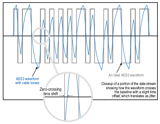 Так как интерфейс AES3 использует один и тот же сигнал для передачи тактового сигнала и данных, возможно возникновение джиттера из-за модуляции данных. Это означает, что нужно изучить закономерности взаимного влияния данных и тактового сигнала. Размывание формы сигнала в результате потерь в кабеле — одно из таких проявлений.