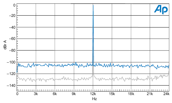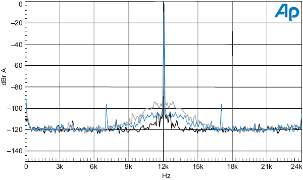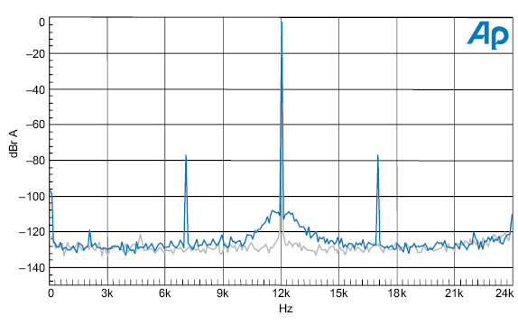График 19. Спектр выхода ЦАП при подаче 12 кГц синусоидального сигнала амплитудой -3 дБ, в присутствии (синим цветом) и в отсутствие широкополосного джиттера амплитудой 9.8 нс