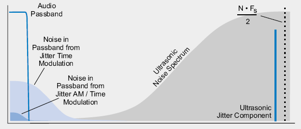 Джиттер воздействует на ультразвуковые шумы так же, как на полезный сигнал. Продукты модуляции могут попасть в звуковой диапазон, а так как ультразвуковые шумы присутствуют даже в случае низкого уровня сигнала, вытеснение шумов в неслышимую область (нойз-шейпинг) теряет все преимущества. Этот эффект дает рост собственных шумов и, таким образом, снижение динамического диапазона конвертора.