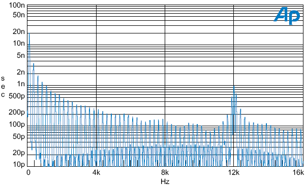 Но тест аналогового тракта System Two показал, что невзвешенный сигнал/шум составляет 96 дБ без влияния джиттера и 80 дБ в его присутствии. Отсюда следует, что джиттер воздействует до +10 кГц и -12кГц смещение составляет 1.32 нс RMS, или 12 пс/Гц^1/2.