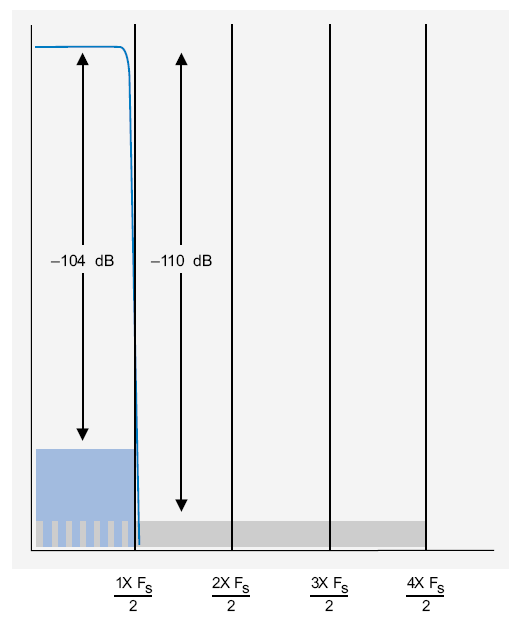 Так как этот шум располагается в диапазоне до 1.5 МГц, его уровень в звуковой области будет меньше указанного. В случае равномерного по спектру джиттера он будет приблизительно на 20 дБ меньше, а в случае распределения 1 / f падение увеличится до 40 дБ. Оставшийся шумовой порог на спектре составит -84 дБ по абсолютному значению.