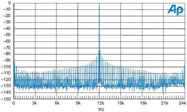 Широкополосные компоненты на графике 21 в действительности больше уровнем там, где джиттер недостаточно подавляется, на низких частотах, что ближе к 12 кГц тону. Видимый джиттер семплинга увеличивается в сравнении с ранними результатами, но не вследствие усиления джиттера. Широкополосный джиттер взаимодействует с приемником цифрового сигнала и цепью восстановления клока. Если, например, цепь восстановления клока использует тактовый сигнал 48 кГц от приемника, а джиттер имеет полосу 200 кГц, то джиттер в области 24 кГц — 200 кГц заворачивается в диапазон 0-24 кГц. Это увеличивает плотность шума джиттера в диапазоне 24 кГц на 10 log (200 / 24) = 9.2 дБ.