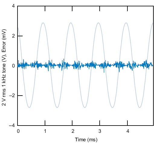 Среднеквадратичное (rms) значение ошибки, вычисленное моделировнием, составляет 124 мкВ rms, или –84 дБ относительно амплитуды тона. По причине частоты дискретизации 176.4 кГц, сигнал ошибки довольно равномерно распределен в полосе 88.2 кГц. Если перенести это на номинальную полосу звуковых частот 20 кГц, уровень шума будет равен 60 мкВ (rms), что составляет 90.5 дБ относительно уровня тона исходного сигнала.