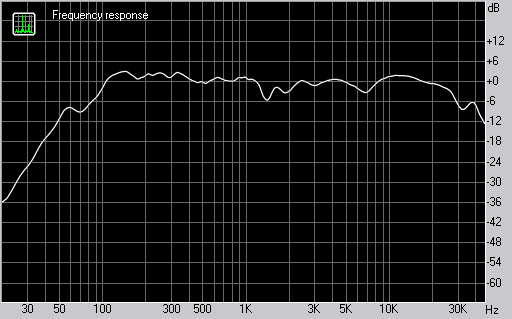 Судя по нашим измерениям, при неравномерности ±4 дБ частотный диапазон колонки составляет 85 Гц — 30 кГц. В паспортных данных на акустику Studiophile AV 40 приведен диапазон 85 Гц — 20 кГц. Как мы видим, нижняя граница соответствует заявленным данным. К сожалению, не указана неравномерность, однако наши измерения демонстрируют хорошие результаты, несмотря на принадлежность акустики к бюджетной категории.