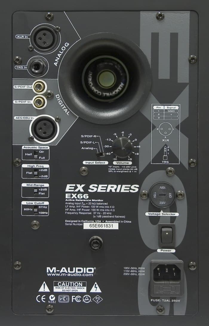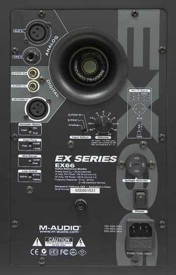 Задняя панель представляет собой металлическую пластину, являющуюся также радиатором для усилительных микросхем. Мониторы EX66 оснащены цифровым интерфейсом. Подключение возможно через коаксиальный или XLR разъемы. Вместе с тем мониторы имеют сквозной цифровой вход, для подключения второго монитора. При этом переключателем «Input Select» необходимо указать, в каком режиме работает тот или иной монитор. Аналоговое подключение возможно посредством XLR и TRS-джек разъемов.