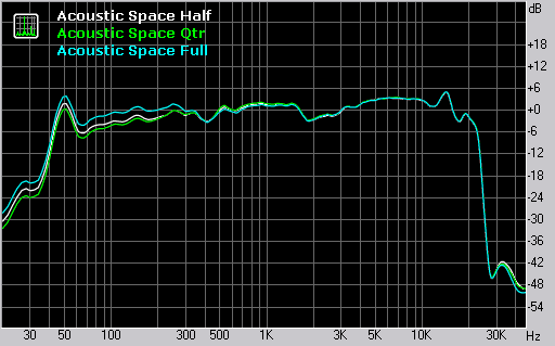 Переключатель «Acoustic Space» служит для подавления низких частот, в зависимости от расположения мониторов. Измерения показывают ослабление в области низких частот на 3 дБ в режиме Half, и на 5 дБ в режиме Qtr.