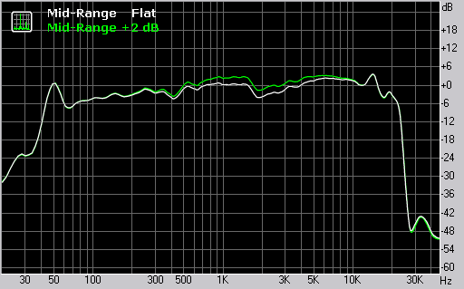 Регулировка на средних частотах осуществляется в диапазоне 300 Гц — 8 кГц. Изменения амплитуды соответствуют заявленным 2 дБ.