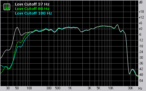 Кроме описанного режима в мониторах предусмотрена регулировка частоты среза фильтра низких частот. Доступно три положения: 37 Гц, 80 Гц и 100 Гц. Наши измерения это подтверждают.