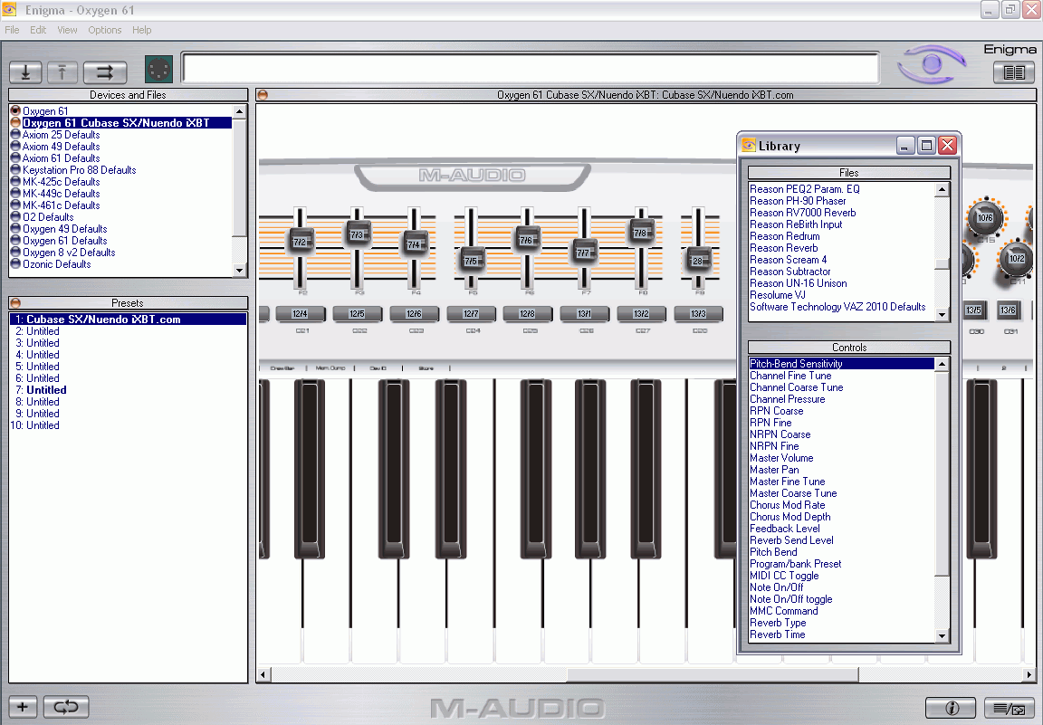 Программа Enigma представляет собой достаточно удобный редактор контроллеров клавиатуры и позволяет создавать неограниченное количество своих конфигураций. Мы решили создать свой пресет для работы в секвенсоре Cubase SX. Для создания своего пресета в программе, необходимо указать MIDI-канал и его адрес для каждого контроллера. Для облегчения задачи, в Enigma предусмотрены базовые настройки некоторых приложений и VSTi, но, к сожалению, параметров для Cubase SX в них не оказалось. Есть настройки контроллеров для Cubase SX от Keystation Pro 88, но они не работают. Узнать, какой именно контроллер в секвенсоре соответствует MIDI-каналу и адресу, нам помогла функция Learn. Для пользователей, столкнувшихся с аналогичной задачей работы в Cubase SX, мы предлагаем свой вариант конфигурации контроллеров, где работает транспортная панель, фейдеры регулируют громкость имеющихся каналов, регуляторы — их панораму, а кнопки под фейдерами выполняют функцию SOLO.
