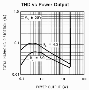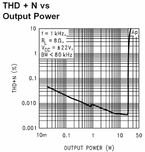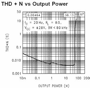 Глядя на приведенный график зависимости THD от мощности можно видеть также замечательные значения мощности при очень низком уровне искажений и у микросхемы LM3886.