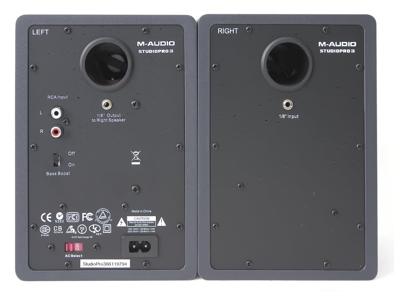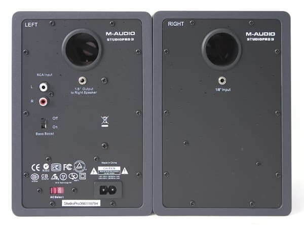 Усилитель расположен в одной из колонок. Подключение пассивной колонки к усилителю осуществляется посредством разъема миниджек. Длина провода для подключения составляет два метра. На задней стороне активной колонки расположен линейный вход, разъем для подключения правой колонки и выключатель функции поднятия НЧ.