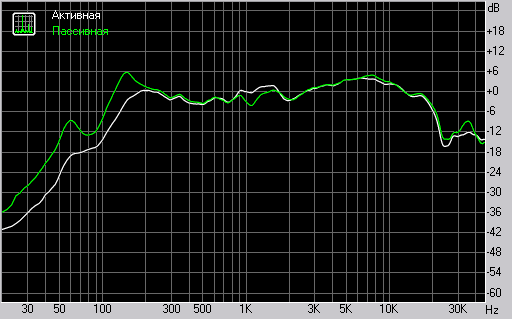 Измерения АЧХ пассивной колонки немного отличаются от активной в области низких частот. Это связано с тем, что внутренний объем корпуса активной колонки занимает усилительная часть.