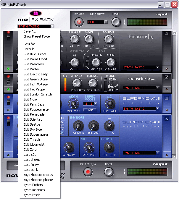 Приложение nioFxRack позволяет загружать эффекты, на скриншоте виден список пресетов и, непосредственно, Fx-модулей. Подавляющее большинство эффектов предназначено исключительно для гитар. Помимо обработок есть подавление сетевого гула и тюнер для настройки инструментов.