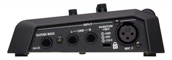 Устройство оснащено четырьмя входами: линейным (1/4 TRS); микрофонным, с фантомным питанием (XLR) и высокоимпедансным инструментальным (1/4 TRS). Кроме этого, V-Studio 20 имеет встроенный стереомикрофон (два миниатюрных микрофона расположены в разных углах на верхней панели).