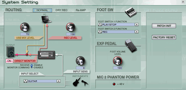 Расположенные с правой стороны поворотные регуляторы также продублированы в Guitar Tracks. MIDI BACKING — регулирует громкость GM-трека, DAW OUTPUT изменяет общую громкость треков, DIRECT MONITOR — аппаратный мониторинг входного сигнала, OUTPUT LEVEL — громкость линейного выхода и выхода на наушники.