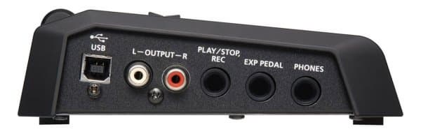 Остальные разъёмы для подключения расположены с противоположной стороны. Линейный выход у V-Studio 20 выполнен на разъёмах RCA. Здесь также расположен выход на наушники, USB-порт и два разъёма для подключения педалей. В стереоразъем Play/Stop, Rec можно подключить две footswitch-педали. Питание устройства осуществляется исключительно от шины USB.