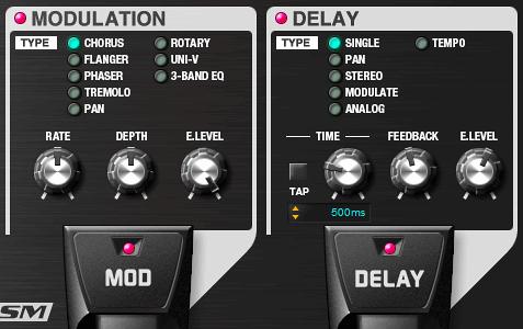 В педали MODULATION имеется: Chorus, Flanger, Phaser, Tremolo, Pan, Rotary, Uni-V, 3-band EQ.