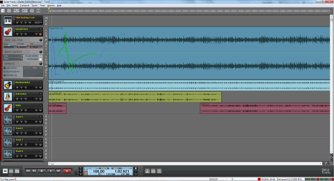 Транспортная панель расположена в нижней части окна. Временную шкалу в милисекундах на линейке можно изменить на семплы или доли в тактах. Имеется закольцованный режим воспроизведения (loop) и даже режим записи punch.