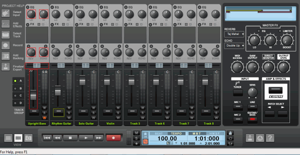Окно с микшером Guitar Tracks сконфигурировано в одном дизайне с расположенными контроллерами на устройстве V-Studio 20. Это выполнено для простоты использования. В окне микшера также все достаточно традиционно. С левой стороны находятся кнопки для вызова хелп-файлов, подробно описывающих основные вопросы. При доступе в интернет здесь также можно ознакомиться даже с видеороликами, повествующими о работе в приложении, способах коммутации, записи.