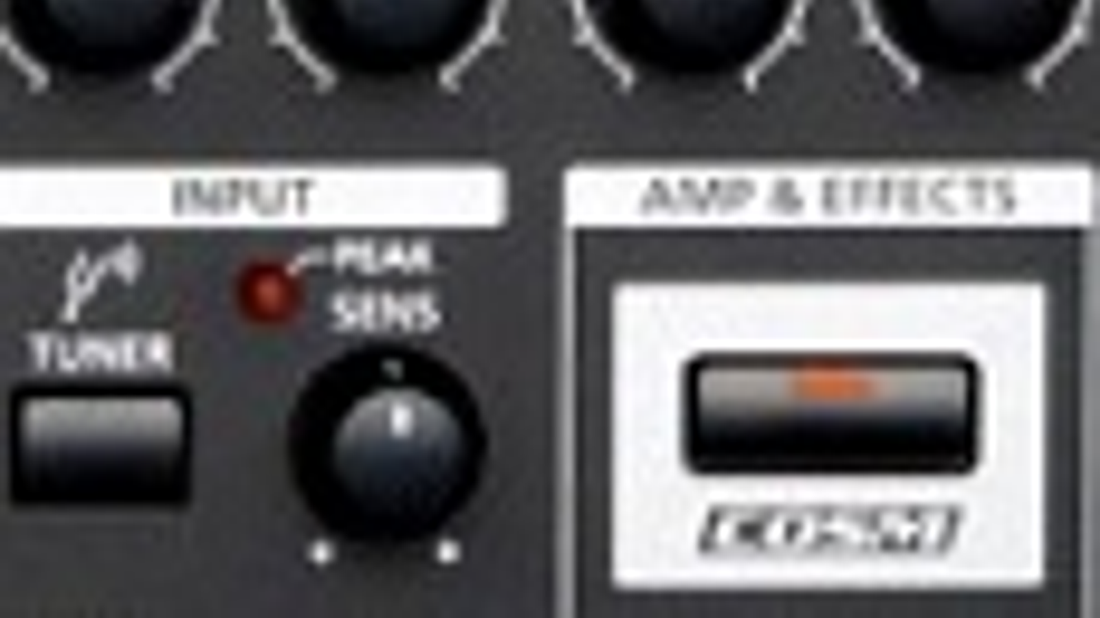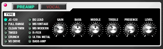 В левом верхнем углу представляется возможность выбора эмуляции различных приборов, реализованных аппаратным эффект-процессором с технологией COSM (Composite Object Sound Modeling). В списке доступно 12 вариантов. В этой секции также имеется четырехполосный эквалайзер.