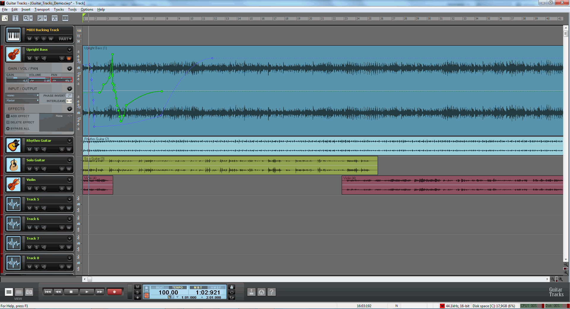 Секвенсор Guitar Tracks имеет два варианта интерфейсов: редактор и микшер. В обоих случаях контроллеры работают одинаково. В окне редактора все отображается достаточно традиционно. Для удобства на каждую дорожку можно назначить свою иконку и цвет. Рабочее место зуммируется до 12 треков на экране. Для каждой дорожки доступна автоматизация громкости, панорамы, посыла на шину ревера и дилэя. Кроме того, есть возможность наложить на трек программные эффекты Cakewalk, а также любые VSTi от сторонних производителей, установленные в вашей системе. При слабой мощности компьютера дорожку можно заранее просчитать — для этого имеется функция freeze.