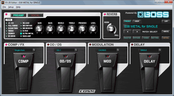 Аппаратные эффекты COSM (Composite Object Sound Modeling), представляющие в данном устройстве наибольший интерес, отображаются при нажатии на кнопку COSM. Регулировка различных параметров эффектов осуществляется в программной оболочке VS-20 Editor.